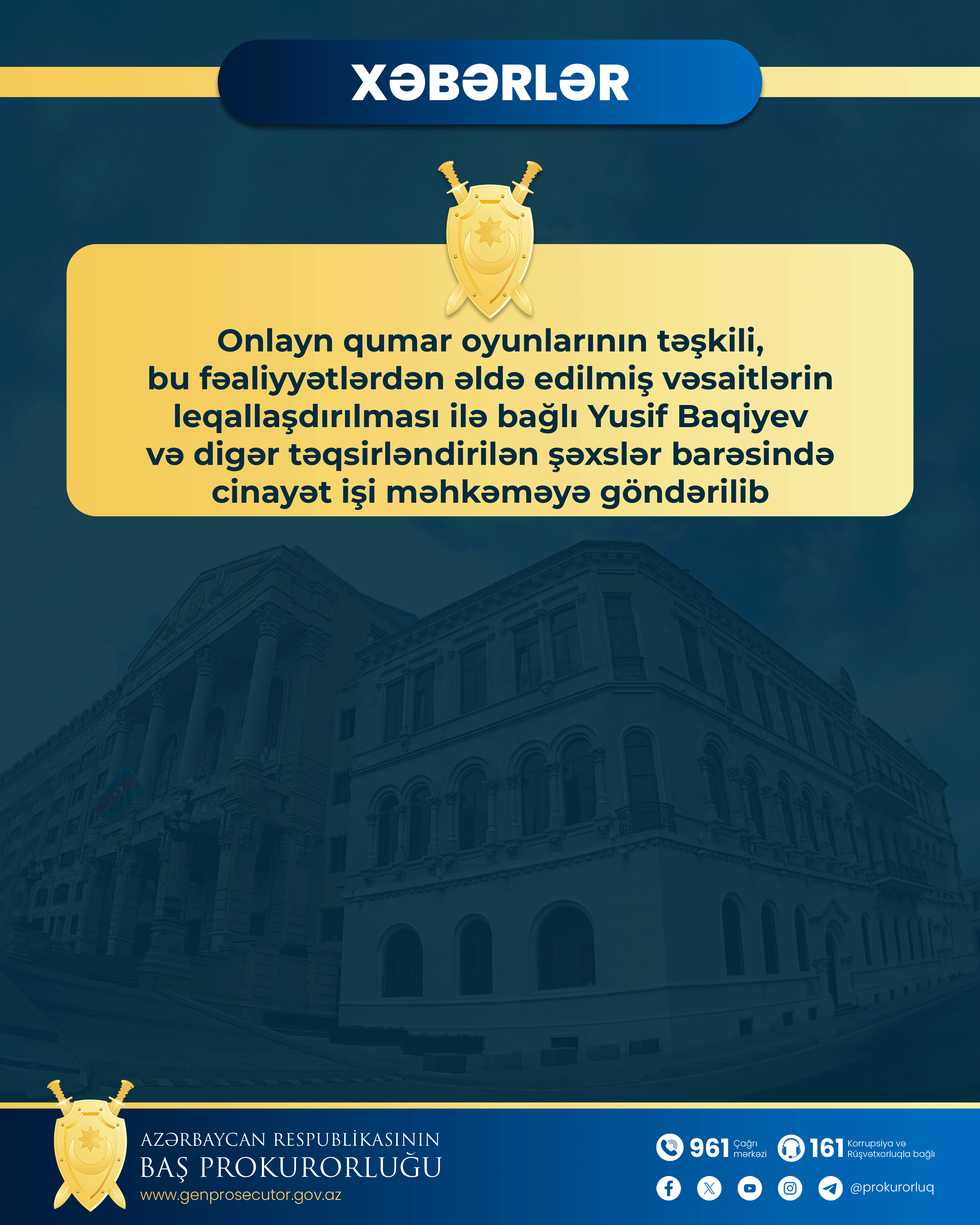 Baş Prokuror yanında Korrupsiyaya qarşı Mübarizə Baş İdarəsində internet informasiya resurslarından istifadə etməklə qumar oyunlarının təşkil edilməsi və əlaqəli qanunsuz əməllər barədə daxil olmuş məlumatlar əsasında həyata keçirilən əməliyyat-axtarış tədbirləri nəticəsində başlanmış cinayət işi üzrə ibtidai istintaq mütəşəkkil dəstənin bir sıra üzvləri barəsində tamamlanıb.