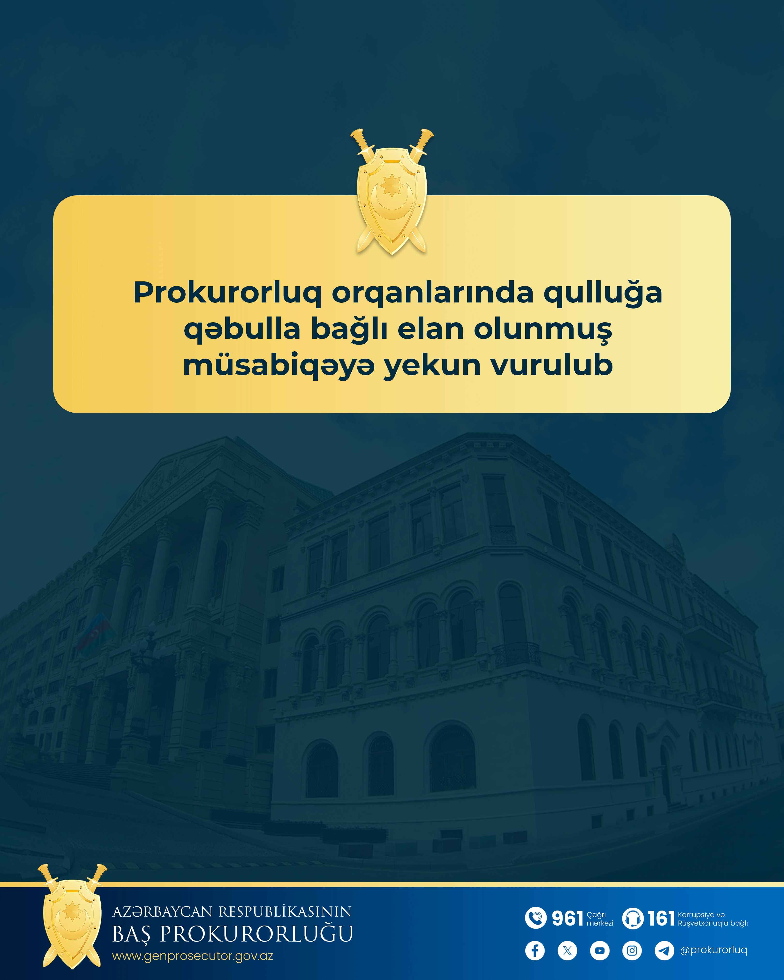 Azərbaycan Respublikası Prezidentinin 19 iyun 2001-ci il tarixli Fərmanı ilə təsdiq edilmiş “Prokurorluğa işə qəbul olunmaq üçün namizədlərlə müsabiqə keçirilməsi qaydaları haqqında Əsasnamə”yə müvafiq olaraq prokurorluq orqanlarında qulluğa qəbul olunmaq istəyən şəxslər üçün 15 aprel 2025-ci il tarixdə elan edilmiş 27-ci müsabiqəyə yekun vurulub.